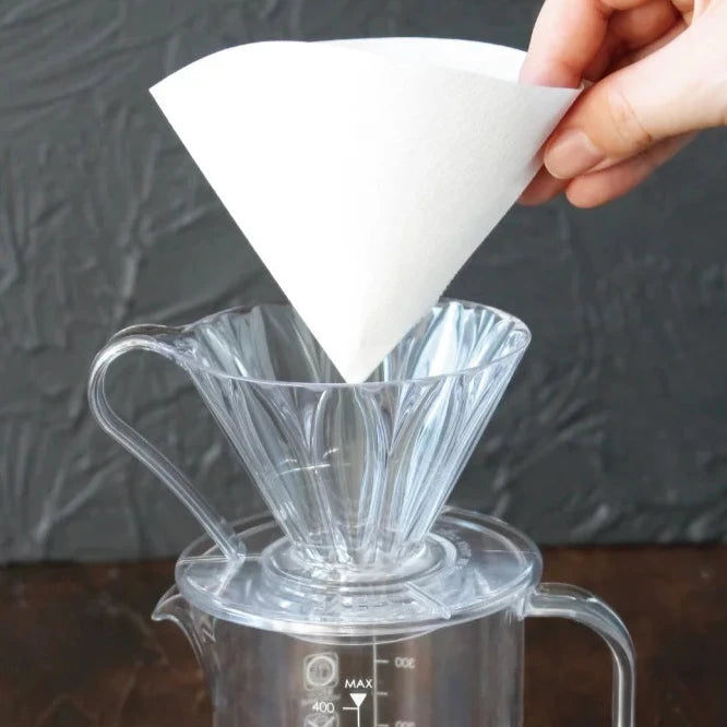 独自の抄紙技術によって、ペーパーの両面に施されたクレープ(しわ)が最大の特長です。このクレープの高さをバランスよい高低差に設定することで、フィルターとドリッパーの間の空気層が十分に保たれ、スムーズなウォーターフローを実現。濁りのないクリアな味わいのコーヒーにきっと驚くはず。